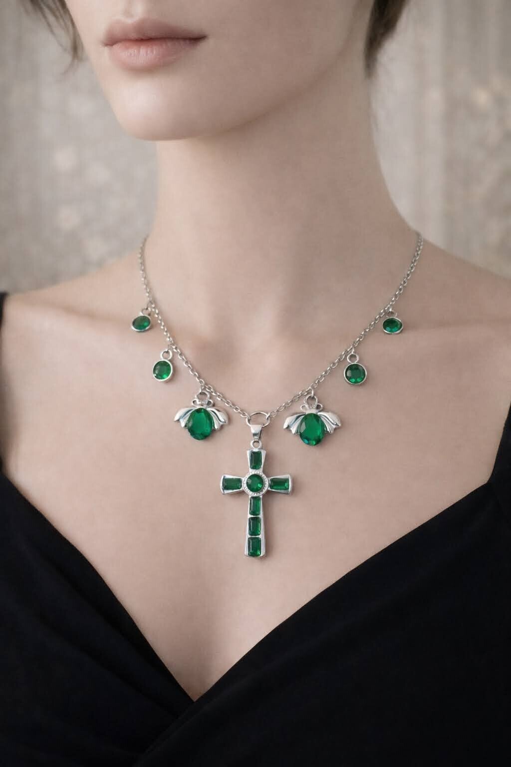 De petits pendentifs assortis viennent accompagner la pièce principale, apportant une touche douce et élégante inspirée par la foi.