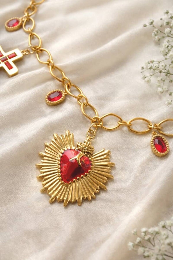 Il se compose de pendentifs Sacré-Cœur délicatement travaillés, accompagné de petites breloques ornées de cristaux rouges qui apportent mouvement et lumière à l'ensemble.