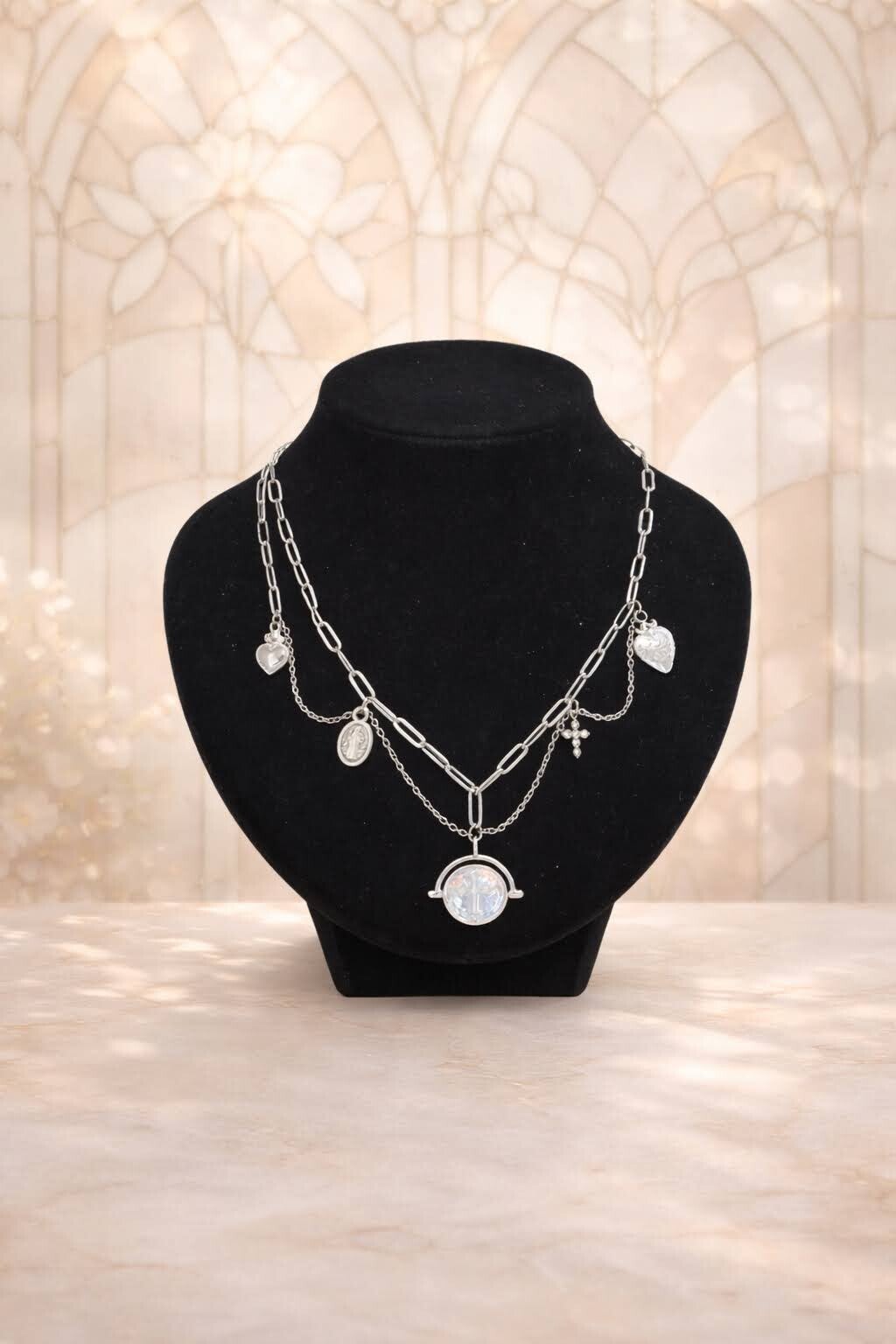 Ce collier est composé d'une chaîne sur laquelle j'ai choisis d'associer plusieurs pendentifs inspirés de la tradition chrétienne.