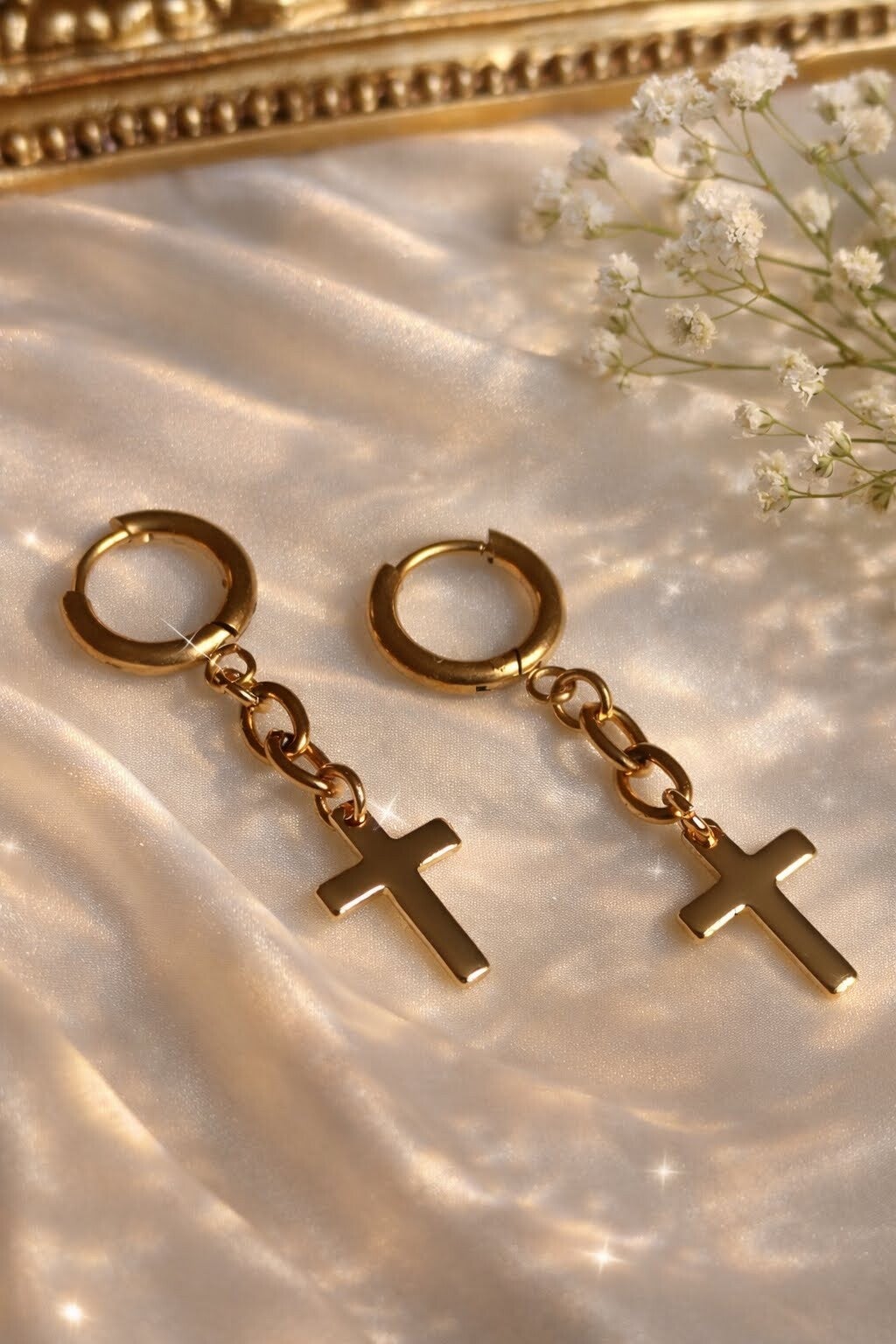 Délicates, ces boucles d’oreilles croix dorées subliment le port de tête avec finesse.