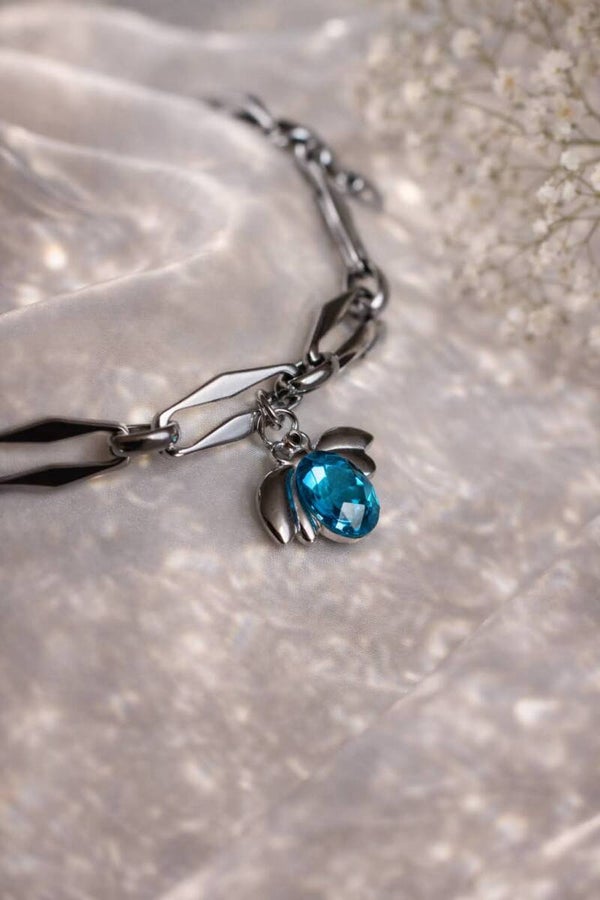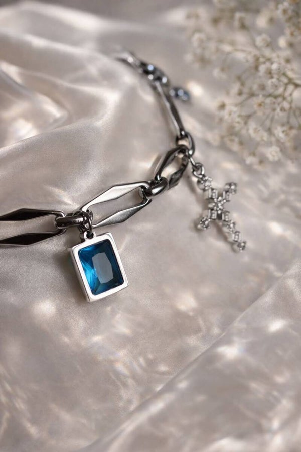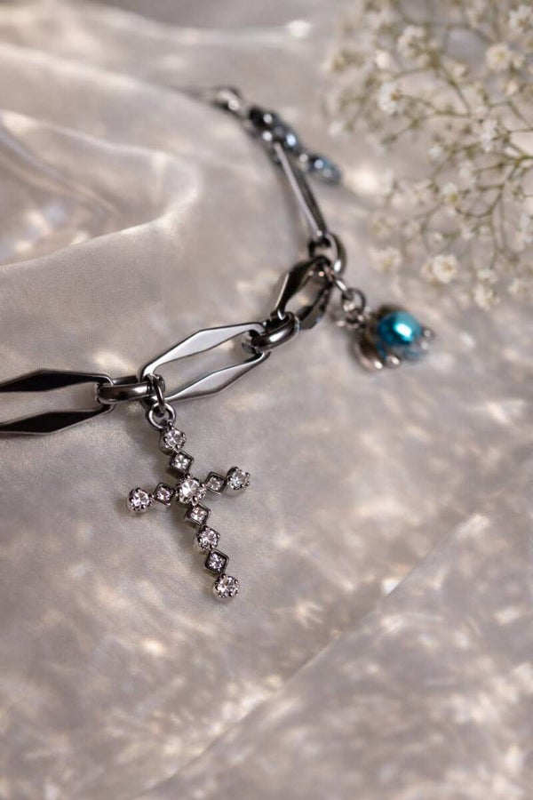 Une croix scintillante, des éclats bleu céleste, et des maillons argentés au caractère affirmé.